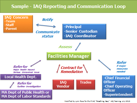 - La prevención es la clave aquí: identifique los contaminantes generados a partir de los procesos de construcción y las posibles vías de contaminación antes de la renovación. Use estas evaluaciones para desarrollar un plan de IAQ para prevenir impactos. Durante y después de la renovación es cuando se generan la mayoría de las quejas de IAQ. MA laq requiere un plan de IAQ en las especificaciones del contrato para los proveedores que realizan la renovación. mientras que la reducción de usedToxics en los materiales de contracción utilizados durante la renovación ayudará a cumplir con estos requisitos